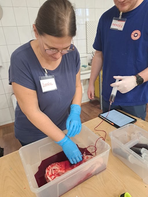 Byli jsme rozděleni na čtyři skupiny. V těchto skupinách jsme potom absolvovali praktické zvládání první pomoci – např. Masáž srdce na figurině, zastavení tepenného krvácení na kusu masa, do kterého byla hadičkou pouštěna červená tekutina apod.