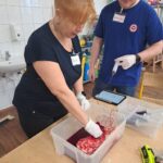 Byli jsme rozděleni na čtyři skupiny. V těchto skupinách jsme potom absolvovali praktické zvládání první pomoci – např. Masáž srdce na figurině, zastavení tepenného krvácení na kusu masa, do kterého byla hadičkou pouštěna červená tekutina apod.
