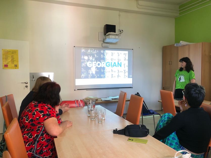 After the “sad” part of the presentation, she cheered us up with a name game she had prepared—everyone had the chance to write their name in the Georgian alphabet. Then, of course, came a tasting of traditional cuisine, which amazed everyone.