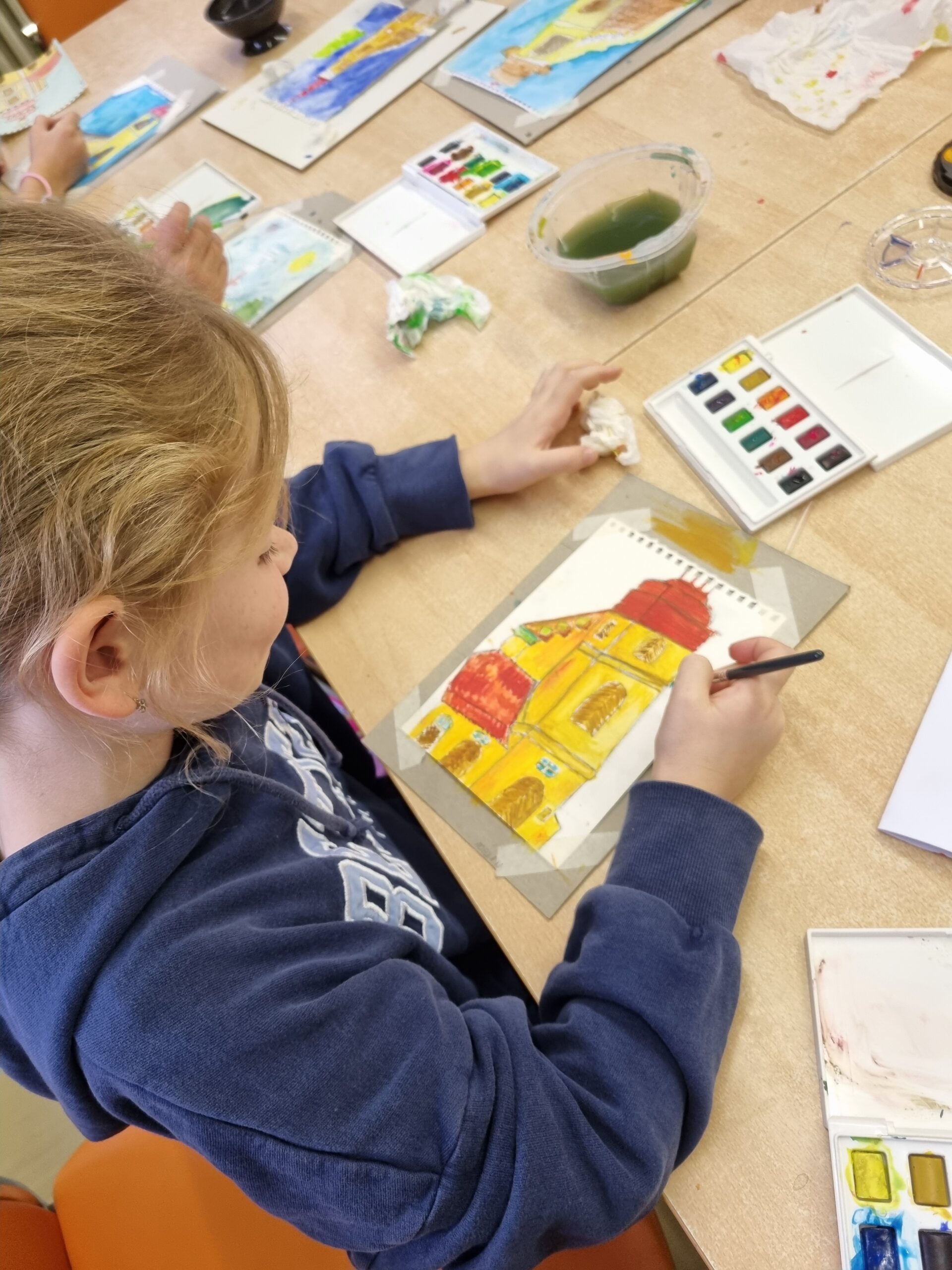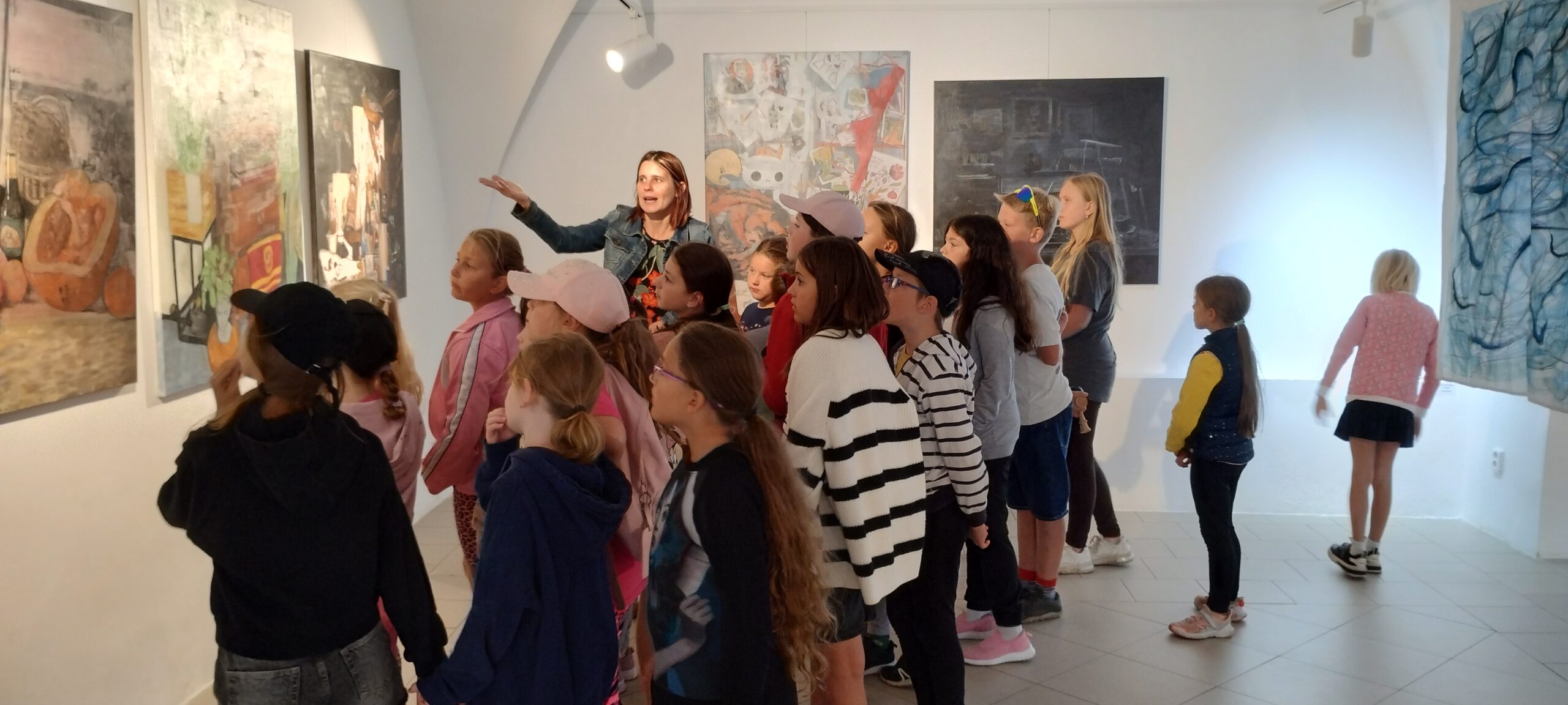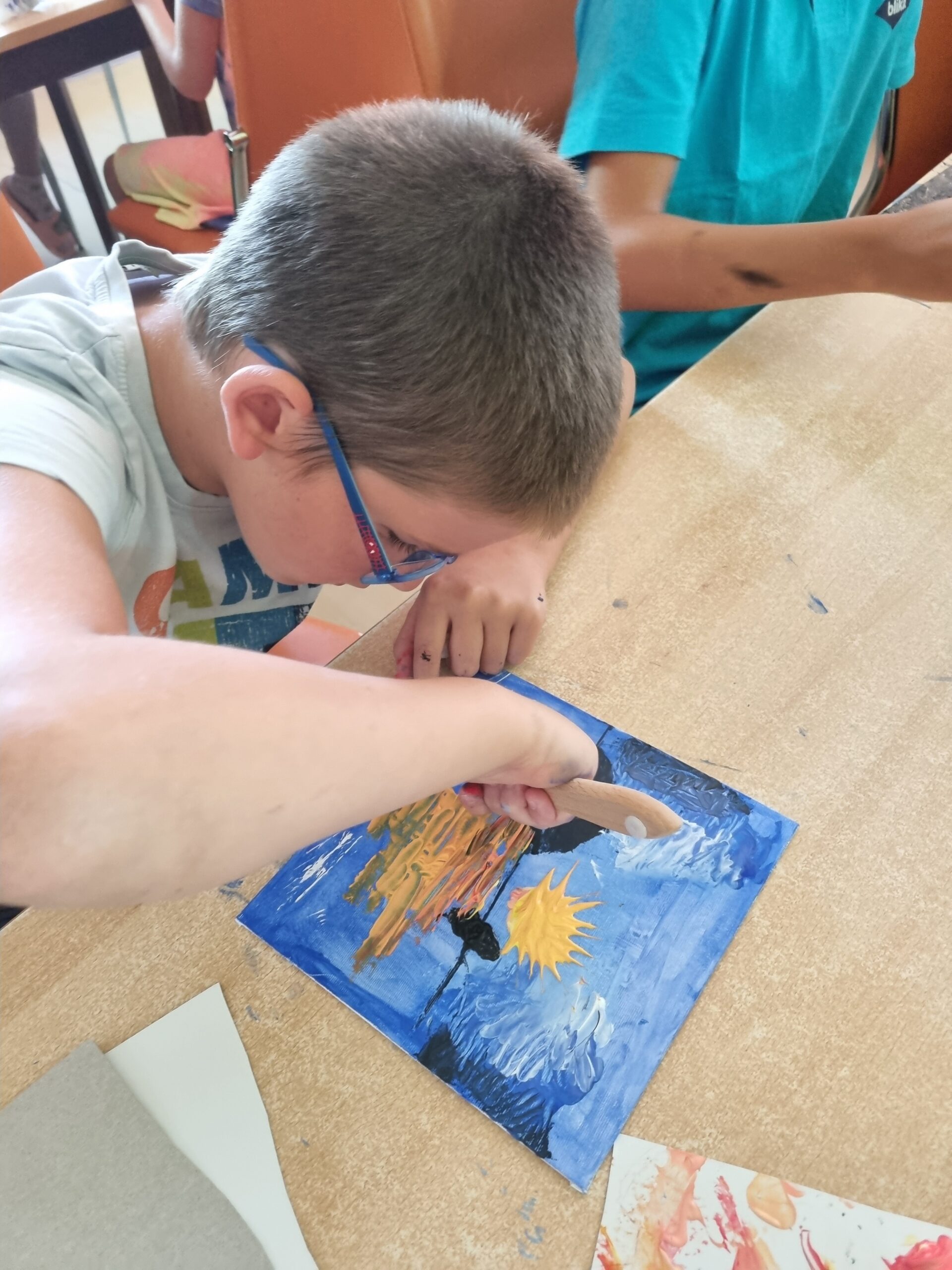 První den jsme se všichni seznámili a pustili jsme se do první výtvarné techniky. Tvořili jsme pomocí akrylových barev a špachtle. Tvoření naše mladé účastníky velmi bavilo. Po předchozím nastudování metody se všichni ponořili do práce. Výsledky byly úžasné.
