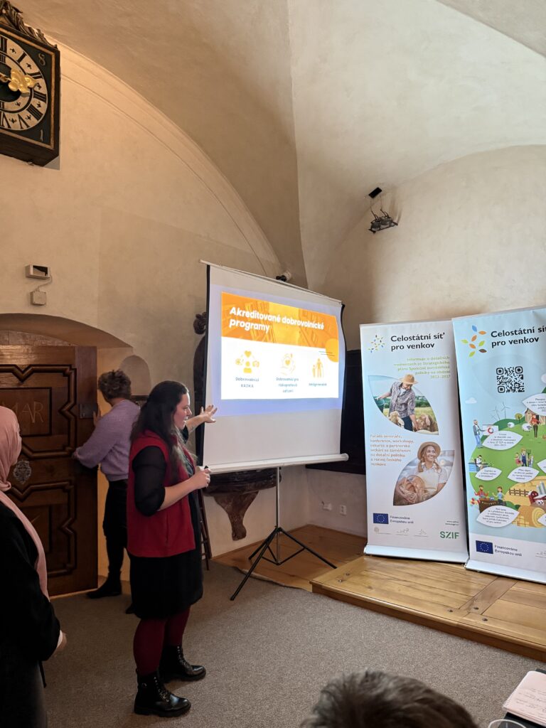Po krátké prezentaci koordinátorek se o svůj osobní příběh podělila i zahraniční dobrovolnice, která u nás aktuálně působí a mluví česky – zúčastnění se o její pohled a zkušenosti velmi zajímali.
