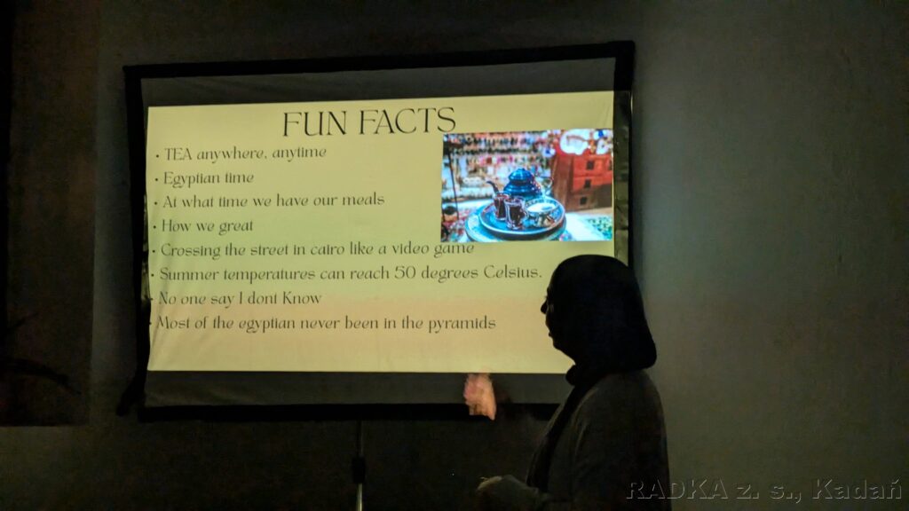 Basmalla zahájila program poutavou prezentací, ve které představila Egypt jako zemi bohatou na historii, tradice i jedinečné písmo. Účastníci měli možnost dozvědět se zajímavosti o egyptské kultuře a zároveň nahlédnout blíže do jejího života.