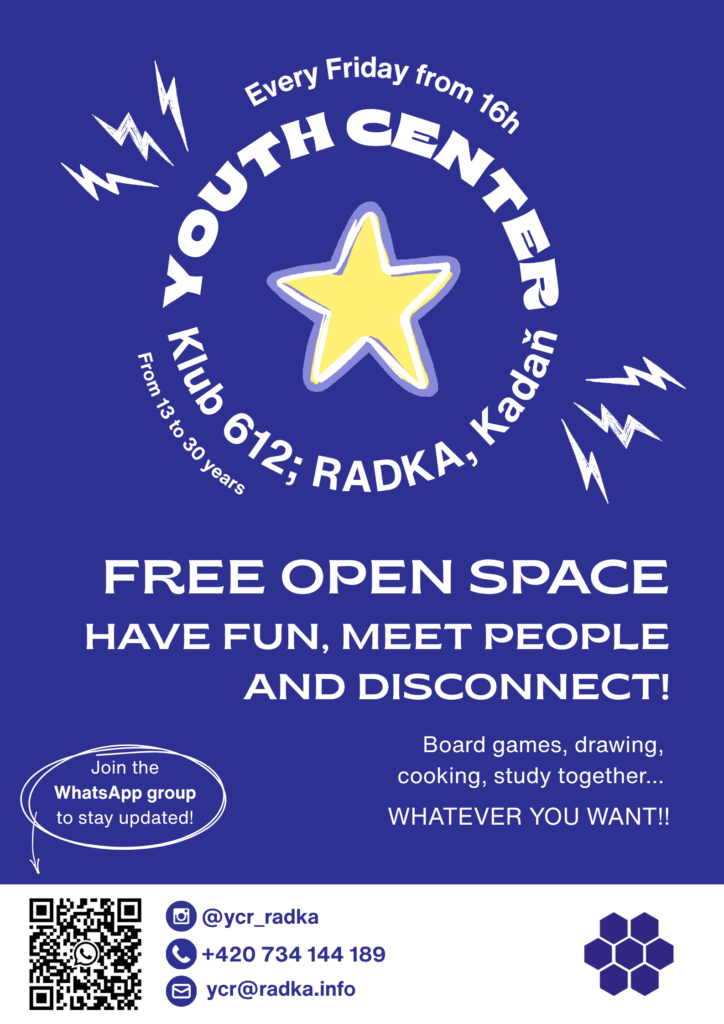 Náš mládežnický klub je opět v provozu, tentokrát s naší dobrovolnicí Janou, která si pro vás připravuje spoustu zajímavých akcí jako jsou přednášky, besedy, diskuze nebo workshopy.